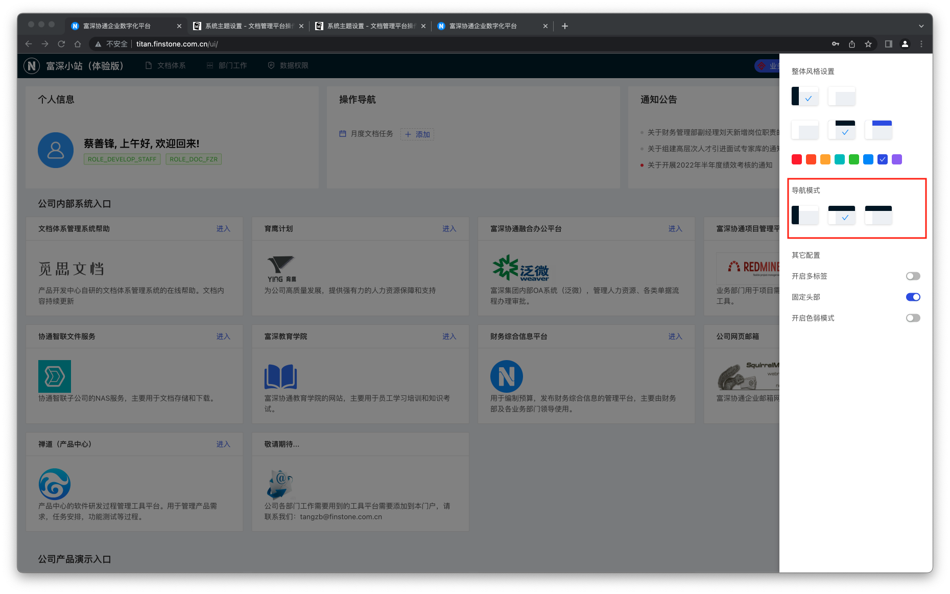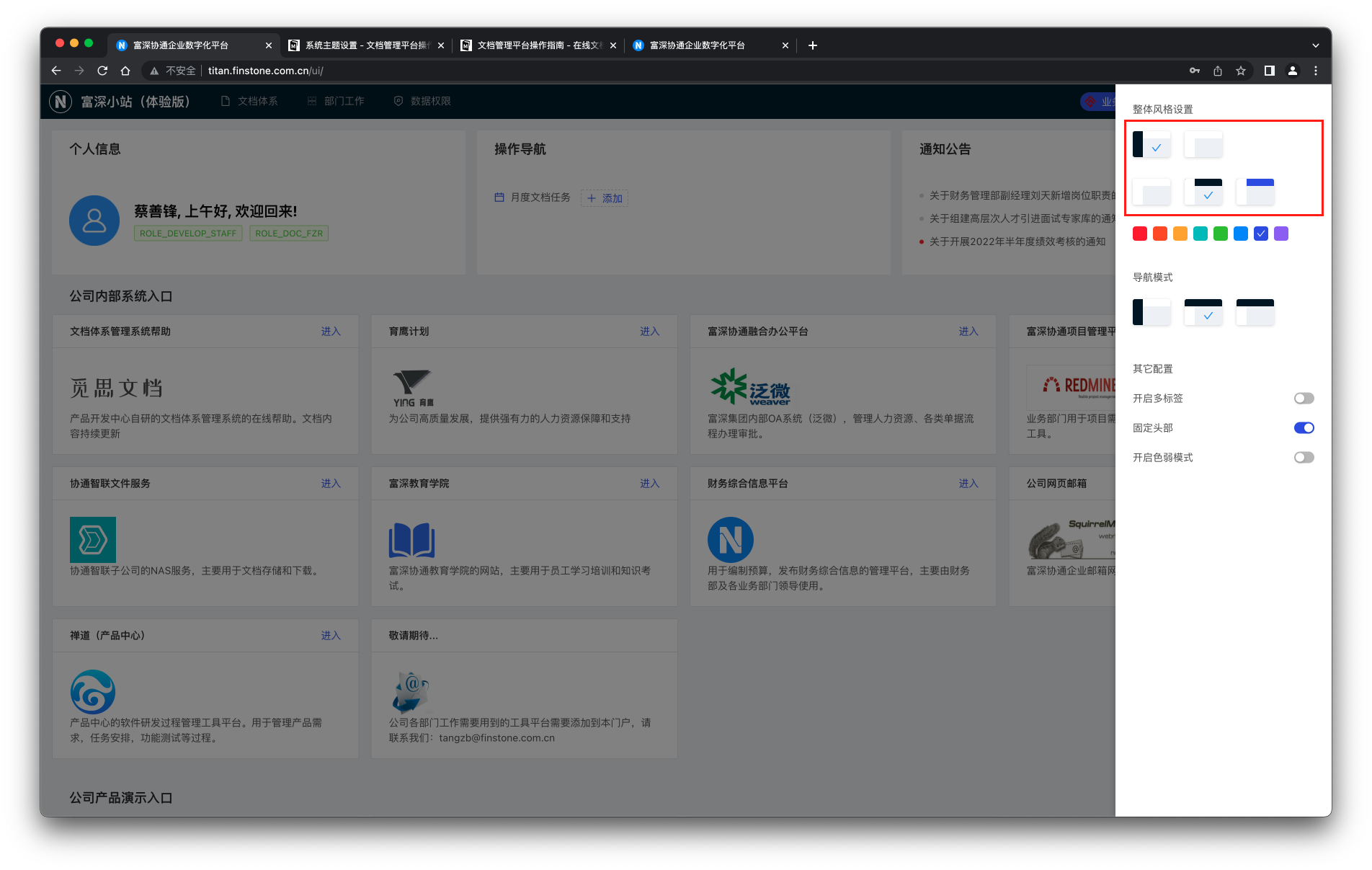 #### 主题设置 登录系统后,点击右上角用户名出现下来菜单选择“主题设置”,如下图:  ##### 修改整体风格  右侧弹出抽屉页面,选择顶部5个不同的图标,可以改变菜单是在左侧还是在顶部,以及菜单栏的背景色为深色或白色。 ##### 修改系统主体色  切换不同的颜色块,系统中的主按钮、操作链接等元素的颜色可以根据自己的喜好进行设定。 ##### 修改菜单栏位置  通过切换不同图标,可以让菜单栏根据自己的喜好显示在顶部或左侧。 ##### 其它设置  开启多标签: 不同菜单,不同页面每次打开会在浏览器内顶部以标签形式打开独立的页面,这样比较适合不同页面之间需要来回切换的场景需要。 固定头部: 系统顶部的logo横条区域在滚动条纵向滚动时保持置顶显示。 色弱模式: 自行开启体验。